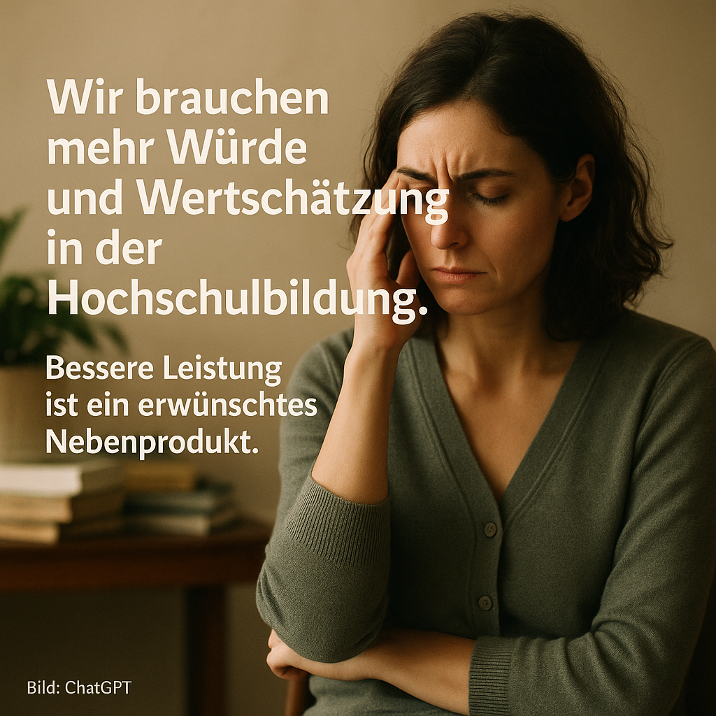 Entmenschlichung fördert Stress und Erschöpfung – das zeigt eine aktuelle Studie. Zwischen befristeten Verträgen, Dauer-Druck und unsicheren Perspektiven rutscht in der Hochschulbildung etwas Entscheidendes weg: unsere Würde – und damit unsere psychische Gesundheit. Deshalb brauchen wir bewusst gestaltete Resonanzräume: kurze 10-Minuten-Check-ins im Team, klare Erreichbarkeitsgrenzen, Sprechstunden mit Fokus auf Beziehung statt Bewertung, Peer-Support-Gruppen zur Entlastung. […]